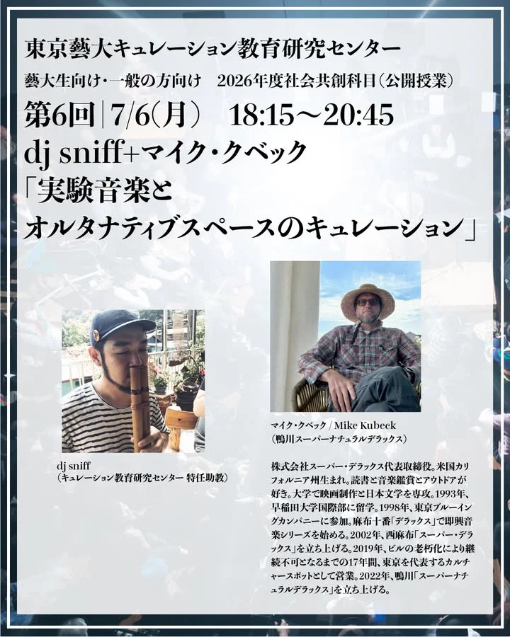 東京藝術大学キュレーション教育研究センター(CCS)が開講する「社会共創科目」「上演・演奏のためのキュレーション1 実践から考える」の第6回に、ゲスト講師としてマイク・クベックが登壇します。